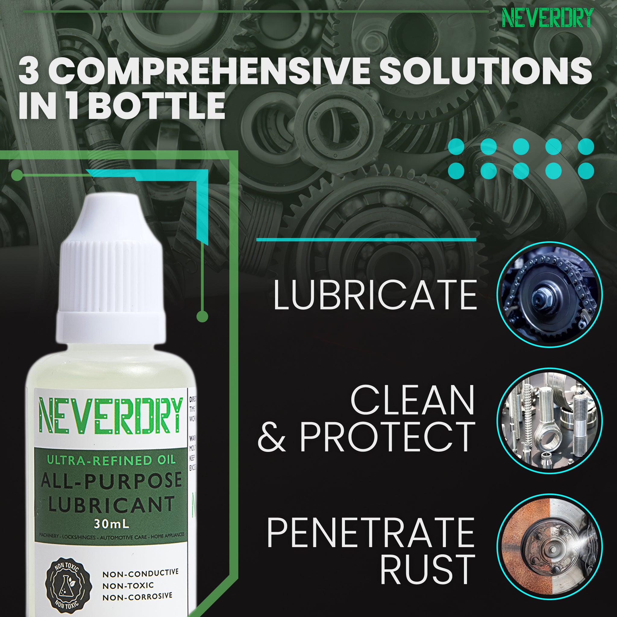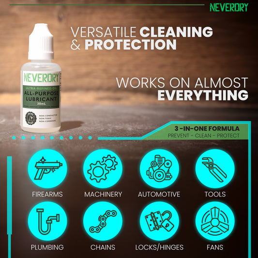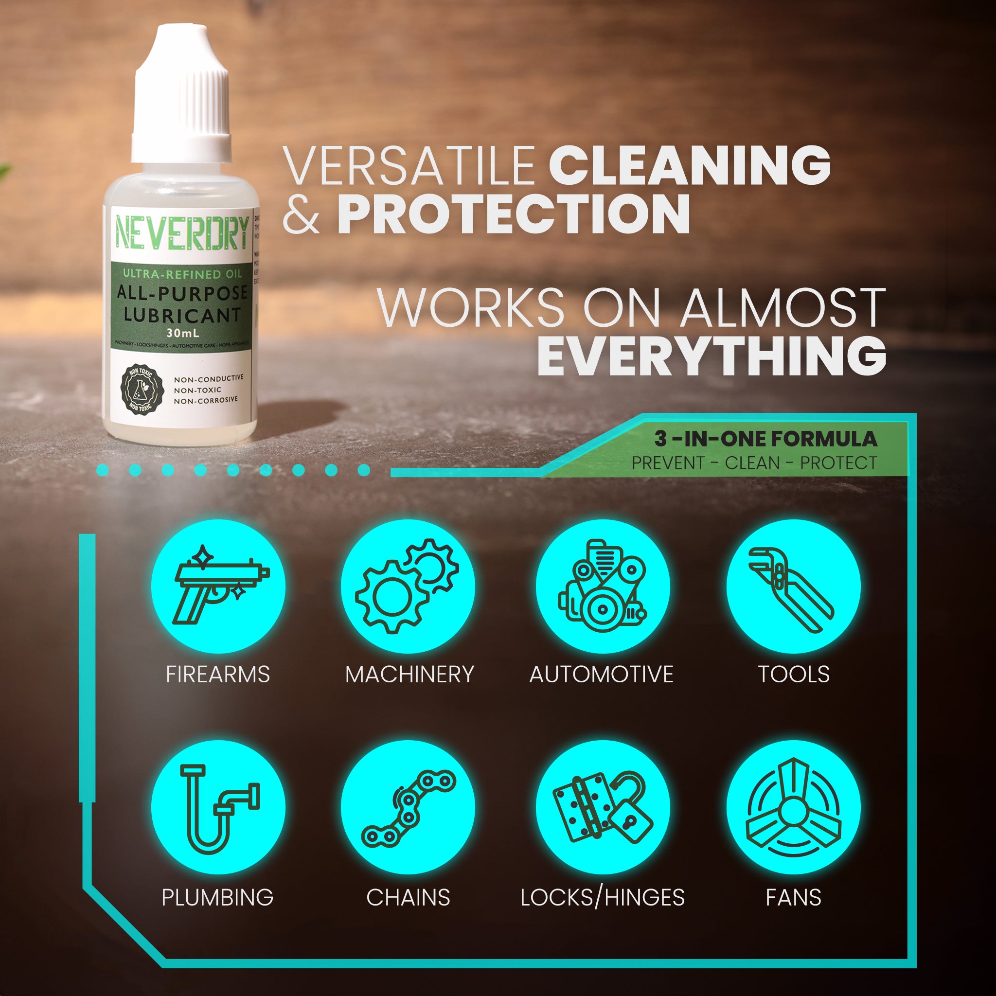 NEVERDRY is the epitome of high-quality lubricants and maintenance products for firearms and general machinery. We are dedicated to providing our customers with the best products to keep their equipment running smoothly and efficiently. Our ultra-refined oil lubricants are designed to reduce friction and wear, ensuring optimal performance and longevity.